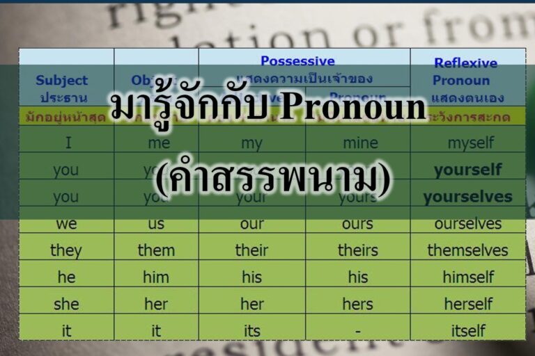 Pronoun คืออะไร ? Pronoun (คำสรรพนาม) คือคำที่ใช้แทนคำนาม เพื่อความสะดวกและความกระชับในการใช้ภาษา อย่างเช่นคำว่า I, you, he, she, it, we, they, everyone, someone เป็นต้น ในภาษาอังกฤษ เมื่อเรากล่าวซ้ำถึงคำนามใด หรือเมื่อเรากล่าวถึงสิ่งที่ทั้งผู้พูดและผู้ฟังรู้กันอยู่แล้วว่าหมายถึงสิ่งไหน เราจะเปลี่ยนไปใช้ pronoun แทน Pronoun พื้นฐาน 7 ตัวคือ I, you, he, she, it, we, they โดยทั้ง 7 ตัวนี้จะมีความพิเศษตรงที่ว่ามันมีหลายรูป เราจะต้องเลือกใช้รูปให้ตรงกับหน้าที่ในประโยค