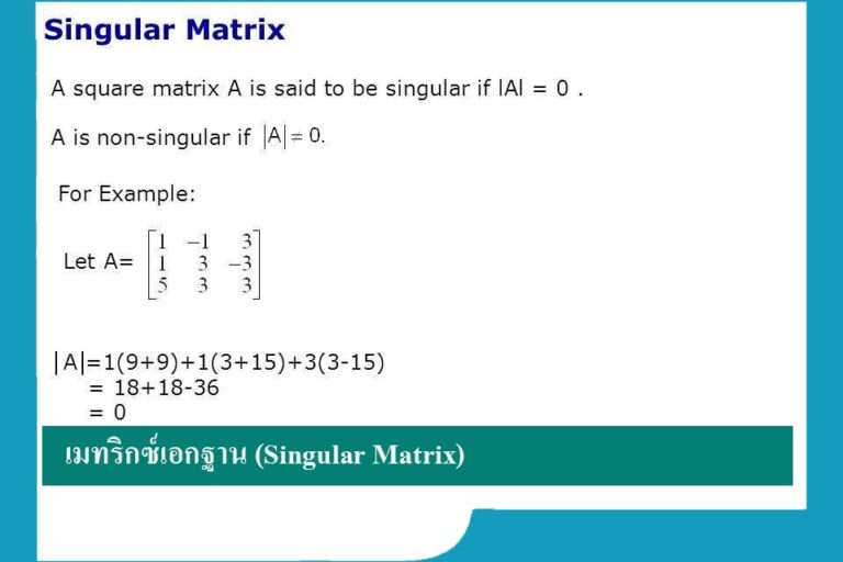 เมทริกซ์เอกฐาน (Singular Matrix) เมตริกซ์จัตุรัสที่ไม่มีตัวผกผันส าหรับการคูณ หรือ กล่าวคือ เมทริกซ์เอกฐานเป็นเมทริกซ์จัตุรัสที่มีค่าตัวก าหนดหรือค่าดีเทอร์มิแนนต์เท่ากับศูนย์ เช่น