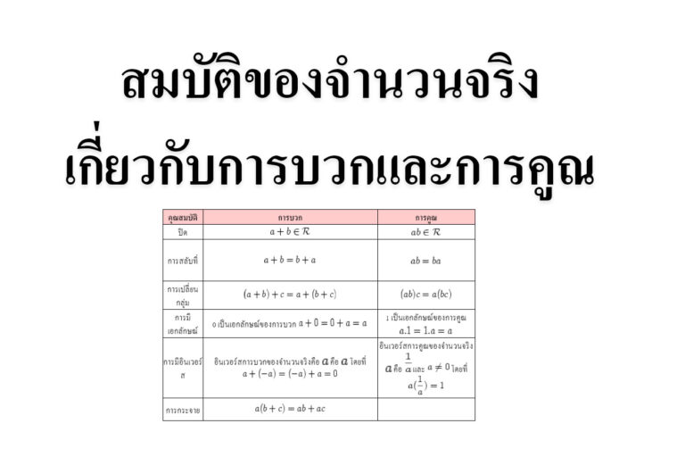 สมบัติของจำนวนจริงเกี่ยวกับการบวกและการคูณ สมบัติของจำนวนจริงเกี่ยวกับการบวก จำนวนตรรกยะ (rational number) เป็นจำนวนจริงที่สามารถเขียนได้ในรูปเศษส่วนของจำนวนเต็มที่ตัวส่วนไม่เป็นศูนย์ และเขียนในรูปทศนิยมซ้ำได้จำนวนอตรรกยะ (irrational number) เป็นจำนวนจริงที่ไม่ใช่จำนวนตรรกยะซึ่งไม่สามารถเขียนในรูปทศนิยมซ้ำหรือเศษส่วนของจำนวนเต็มที่ตัวส่วนไม่เป็นศูนย์แต่เขียนได้ในรูปทศนิยมไม่ซ้ำ และสามารถกำหนดค่าโดยประมาณได้การเขียนเศษส่วนในรูปทศนิยม คือ การนำส่วนไปหารเศษการเขียนทศนิยมในรูปเศษส่วน คือ ทศนิยม 1 ตำแหน่ง หารด้วย 10 2