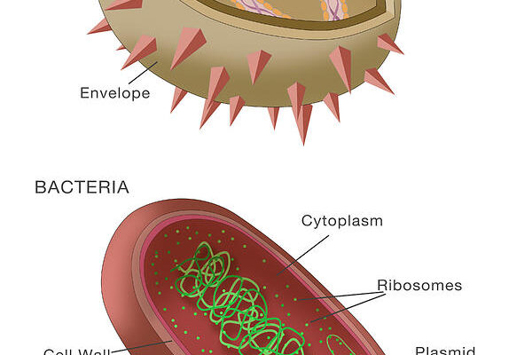 ความแตกต่างระหว่างไวรัสและแบคทีเรีย ไวรัส เป็นสิ่งมีชีวิตที่มีรูปร่างหลากหลายและมีขนาดเล็กมาก ซึ่ง 1 ในไวรัสที่ใหญ่ที่สุดมีความยาวเพียง 450 นาโนเมตรเท่านั้น หรือเทียบเท่ากับแบคทีเรียขนาดเล็กชนิดหนึ่ง ไวรัสมีโปรตีนเป็นส่วนประกอบหลักที่เคลือบอยู่ชั้นผิวภายนอกและเป็นศูนย์กลางของสารพันธุกรรมอย่างดีเอ็นเอ (DNA) หรืออาร์เอ็นเอ (RNA) ของไวรัส โดยไวรัสจำเป็นต้องอาศัยอยู่ในเซลล์ของสิ่งมีชีวิตอย่างคน สัตว์ หรือพืช เพื่อเพิ่มจำนวนขึ้น