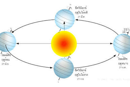 ก่อนจะไปพูดถึงเรื่องทิศทางของแสงแดด มาทำความเข้าใจคร่าวๆ เกี่ยวกับฤดูกาลกันก่อนนะครับ โดยปกติ แกนโลกของเราที่วัดจากขั้วโลกเหนือ ไปยังขั้วโลกใต้นั้นไม่ได้ตั้งตรงเป้ะๆ แต่วางตัวในแนวเอียงประมาณ 23.5 องศา เทียบกับระนาบวงโคจรของโลก และตลอดเวลาที่โลกหมุนรอบดวงอาทิตย์นั้น แกนโลกจะเอียงเท่าเดิมเสมอ ทำให้มีช่วงเวลาที่โลกเอียงแกนข้างใดข้างหนึ่งเข้าหาดวงอาทิตย์มากกว่าอีกข้างหนึ่ง ซึ่งส่งผลให้เกิดเป็นฤดูกาลขึ้นมานั่นเอง