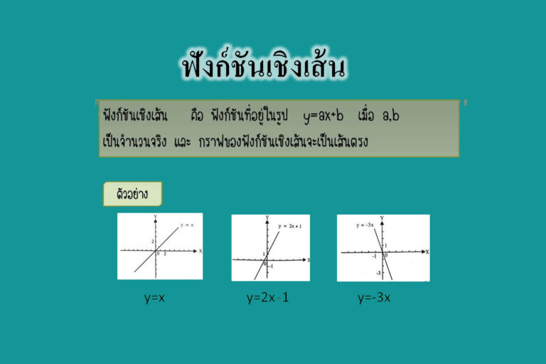 ฟังก์ชันเชิงเส้น ฟังก์ชันเชิงเส้น คือ ฟังก์ชันที่อยู่ในรูป y = ax+b เมื่อ a ,b เป็นจำนวนจริง และ กราฟของฟังก์ชันเชิงเส้นจะเป็นเส้นตรง