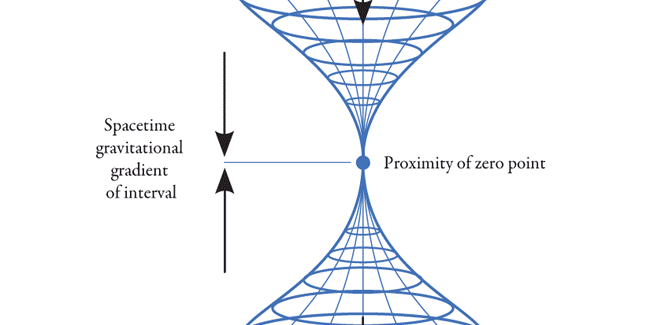 ทฤษฎีสัมพัทธภาพพิเศษถูกกำหนดในกรณีที่ไม่มีแรงโน้มถ่วง สำหรับการใช้งานจริง มันคือโมเดลที่เหมาะสมเมื่อใดก็ตามที่สามารถละเลยแรงโน้มถ่วงได้ นำเข้าสู่การเล่นแรงโน้มถ่วงและสมมติว่าเป็นสากลของการเคลื่อนไหวฤดูใบไม้ร่วงฟรีซึ่งเป็นเหตุผลที่คล้ายคลึงกับในส่วนก่อนหน้านี้มีผลบังคับใช้: ไม่มีโลกกรอบเฉื่อย แต่มีเฟรมเฉื่อยโดยประมาณเคลื่อนที่เคียงข้างอนุภาคที่ตกลงมาอย่างอิสระ แปลเป็นภาษาของกาลอวกาศ: เส้นตรงที่เหมือนเวลาซึ่งกำหนดกรอบเฉื่อยที่ปราศจากแรงโน้มถ่วงจะเปลี่ยนรูปเป็นเส้นที่โค้งสัมพันธ์กัน ซึ่งบ่งชี้ว่าการรวมของแรงโน้มถ่วงทำให้เกิดการเปลี่ยนแปลงในเรขาคณิตของกาลอวกาศ [34]