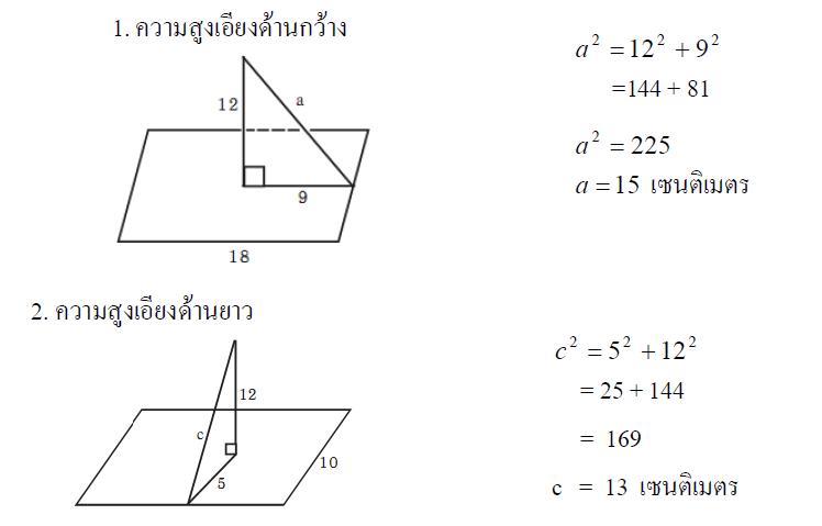 ตัวอย่างที่ 1 พีระมิดฐานสี่เหลี่ยมผืนผ้า กว้าง 10 เซนติเมตร ยาว 18 เซนติเมตร และความสูงของพีระมิดเป็น 12 เซนติเมตร จงหาความสูงเอียงของพีระมิดทั้งสองด้าน