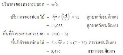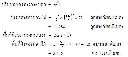 ตัวอย่างที่ 2 ท่อนไม้ทรงกระบอกอันหนึ่ง หน้าตัดมีเส้นผ่านศูนย์กลางเท่ากับ 14 เซนติเมตร ยาว 0.72 เมตร จงหาปริมาตรและพื้นที่ผิวของไม้ท่อนนี้วิธีทำ