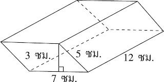 วิธีทำ ปริมาตรของปริซึม = พื้นที่ฐาน x สูง= (ฐาน x สูง) x สูง= (7 x 3) x 12= 252 ลูกบาศก์เซนติเมตรพื้นที่ด้านข้าง = ความยาวรอบรูป x สูง= (7 + 5 + 7 + 5) x 12= 288 ตารางเซนติเมตรพื้นที่หัวท้าย = 2 (7 x 3)= 42 ตารางเซนติเมตรดังนั้น พื้นที่ผิวของปริซึมเท่ากับ 288 + 42 = 330 ตารางเซนติเมตร