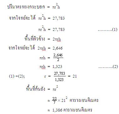 ตัวอย่างที่ 4 ถังทรงกระบอกใบหนึ่งมีปริมาตร 27,783 ลูกบาศก์เซนติเมตร พื้นที่ผิวข้าง 2,646 ตารางเซนติเมตร จงหาพื้นที่ก้นถังใบนี้