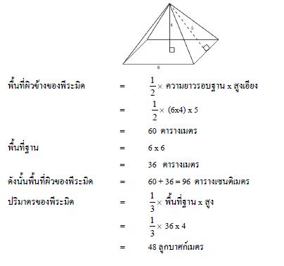 ตัวอย่างที่ 2 พีระมิดแห่งหนึ่งมีฐานเป็นรูปสี่เหลี่ยมจัตุรัส ยาวด้านละ 6 เมตร สูงเอียง 5 เมตร และสูงตรง 4 เมตร จงหาพื้นที่ผิวและปริมาตรของพีระมิด