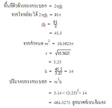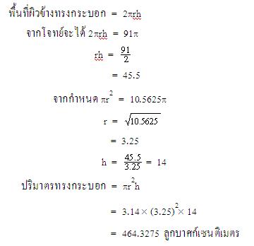 ตัวอย่างที่ 3 ทรงกระบอกอันหนึ่งมีพื้นที่ผิวข้าง 91p ตารางเซนติเมตร และพื้นที่ฐาน 10.5625p ตารางเซนติเมตร จงหาปริมาตรของทรงกระบอกนี้ (p » 3.14)