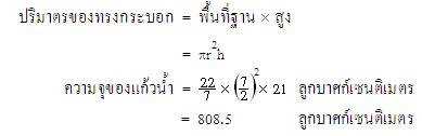 ตัวอย่างที่ 1 แก้วน้ำทรงกระบอกใบหนึ่งวัดเส้นผ่านศูนย์กลางภายในได้ 7 เซนติเมตร ใส่น้ำได้ลึก 21 เซนติเมตร น้ำ