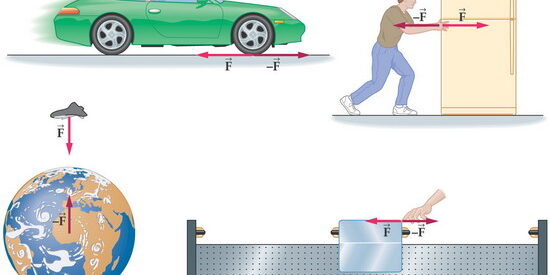 การผลักหรือการดึง เมื่อวัตถุชิ้นหนึ่งผลักหรือดึงวัตถุอีกชิ้นหนึ่ง นักเรียนอาจกล่าวได้ว่าวัตถุชิ้นแรกออกแรงกระทำต่อวัตถุชิ้นที่สอง นักเรียนออกแรงกระทำต่อปากกาในขณะที่นักเรียนเขียนหนังสือ นักเรียนออกแรงกระทำต่อหนังสือในขณะยกหนังสือนักเรียนออกแรงกระทำต่อซิปกางเกงในขณะรูดซิป นักเรียนออกแรงกระทำต่อลูกบอลในขณะที่ขว้างลูกบอลนักเรียนออกแรงกระทำต่อรถในขณะที่นักเรียนเข็นรถ และออกแรงกระทำกับตะปูในขณะที่ใช้ค้อนตอกตะปู