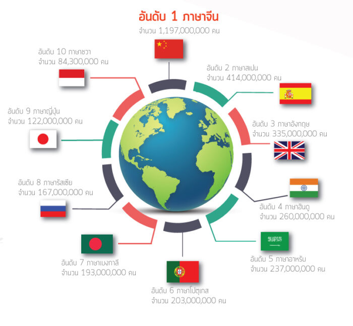จากการสำรวจ พบว่าทั่วโลกมีภาษาแตกต่างกันถึง ๕,๐๐๐ ภาษา ภาษาที่ใช้กัน มากที่สุดในโลกคือ ภาษาจีน มีคนพูดภาษานี้ ถึงพันล้านคนเศษ รองลงมาคือ ภาษาอังกฤษ ภาษาฮินดี