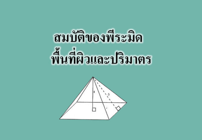 สมบัติของพีระมิด – พื้นที่ผิวและปริมาตร พีระมิด ในทางคณิตศาสตร์ ให้ความหมายคำว่า พีระมิด ดังนี้ รูปเรขาคณิตสามมิติที่มีฐานเป็นรูปเหลี่ยมใดๆ มียอดแหลมที่ไม่อยู่บนระนาบเดียวกันกับฐาน และหน้าทุกหน้าเป็นรูปสามเหลี่ยมที่มีจุดยอดร่วมกันที่ยอดแหลมนั้น เรียกว่า พีระมิด
