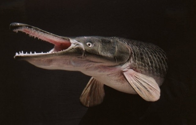 มีลักษณะเด่น คือ มีส่วนปากยาวคล้ายกับจระเข้หรืออัลลิเกเตอร์ รูปร่างกลมยาว ตากลมสีดำ บริเวณลำตัวจรดหางคล้ายปลา มีครีบเล็กใต้ท้อง 2 ครีบคู่ ใต้ท้องสีขาว บริเวณปลายหาง ใกล้หางมีครีบใหญ่อีก 2 ครีบ ซึ่งโคนหางด้านบนมีขนาดใหญ่กว่าโคนหางด้านล่างอย่างเห็นได้ชัดเจน ครีบหางกลมมนเป็นรูปพัด เป็นปลาที่กระจายพันธุ์อยู่ในแหล่งน้ำจืดต่าง ๆ เช่น แม่น้ำ หรือทะเลสาบ ของสหรัฐอเมริกาทางตอนใต้ เช่น รัฐฟลอริดา และหลุยส์เซียนา