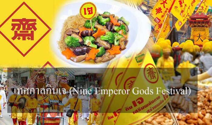 เทศกาลกินเจ (Nine Emperor Gods Festival) ความหมายของเจ คำว่า “เจ” ในภาษาจีนทางพุทธศาสนาฝ่ายมหายานมีความหมายว่า “อุโบสถ” เดิมหมายความว่า “การรับประทานอาหารก่อนเที่ยงวัน” ตามแบบอย่างของชาวพุทธที่รักษาอุโบสถศีล หรือรักษาศีล 8 ที่จะไม่รับประทานอาหารหลังเที่ยงวันไปแล้ว แต่สำหรับพุทธนิกายมหายานนั้น การรักษาอุโบสถศีลจะรวมถึงการไม่รับประทานเนื้อสัตว์ด้วย เราจึงนิยมเรียกการไม่ทานเนื้อสัตว์รวมไปกับการกินเจ ในปัจจุบันผู้ที่รับประทานอาหารทั้ง 3 มื้อ แต่ไม่กินเนื้อสัตว์ก็ยังคงเรียกว่า “กินเจ” ดังนั้นความหมายของคนกินเจ ไม่เพียงแต่ไม่ทานเนื้อสัตว์ แต่ยังต้องดำรงตนอยู่ในศีลธรรมอันดีงาม มีความบริสุทธิ์ สะอาด ทั้งกาย วาจา ใจ