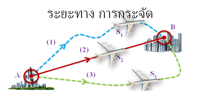 ระยะทางและการกระจัด ระยะทางและการกระจัด ในขณะที่เราเคลื่อนที่ เราจะเปลี่ยนตำแหน่งที่อยู่ตลอดแนว เช่น ขณะเราขับรถยนต์ไปตามท้องถนน เราจะเคลื่อนที่ผ่านถนน ถนนอาจเป็นทางตรง ทางโค้ง หรือหักเป็นมุมฉาก ระยะทางที่รถเคลื่อนที่อาจเป็นระยะทางตามตัวเลขที่ราบของการเคลื่อนที่ แต่หากบางครั้งเราจะพบว่า จุดปลายทางที่เราเดินทางห่างจากจุดต้นทางในแนวเส้นตรง หรือในแนวสายตาไม่มากนัก