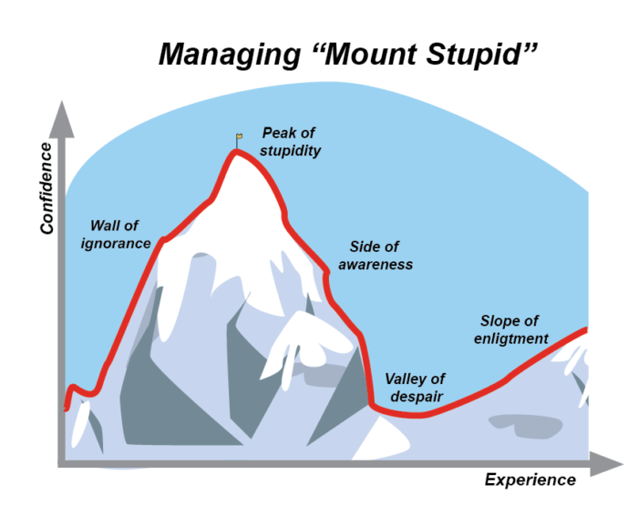 ในปี 1999 David Dunning และ Justin Kruger ได้ทำการทดลองที่โ่ด่งดังมาก รู้จักกันในชื่อ Dunning-Kruger Effect…ระบุถึงสถานการณ์ที่ คนที่รู้น้อยที่สุด ดันรู้สึกว่าตัวเองรู้มากพอ และ ตัดสินใจได้โดยที่ไม่ได้ตระหนักเลยว่า นั่นอาจเป็นการตัดสินใจที่แย่ (Unknown Competence) . สิ่งที่เกิดตามมาก็คือ
