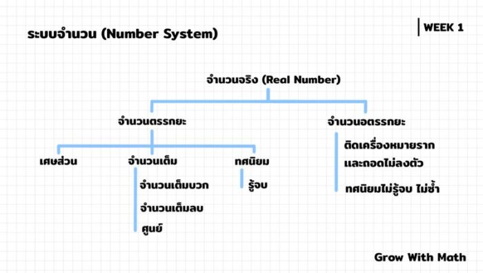 จำนวนจริง ตัวเลขเป็นสัญลักษณ์ที่มนุษย์ใช้แทนปริมาณต่างที่มีอยู่ในธรรมชาติ ในยุคเริ่มแรกเรารู้จักจำนวนที่มีลักษณะเต็มหน่วยที่เป็นปริมาณเชิงประจักษ์ในธรรมชาติ ชุดจำนวนเหล่านี้ถูกนำมารวมกันเป็นเซตเรียกว่าเซตจำนวนนับ (Natural numbers) ต่อมามีการกำหนดเลขศูนย์ และจำนวนตรงกันข้ามกับจำนวนนับ จึงเรียกจำนวนสามกลุ่มนี้ใหม่ว่า จำนวนเต็มบวก จำนวนเต็มศูนย์ และจำนวนเต็มลบ เกิดเป็นเซตจำนวนเต็ม ต่อมามีการศึกษาปริมาณเชิงสัดส่วน (Ratio) ที่เกิดจากการแบ่งในลักษณะการหารกันระหว่างจำนวนเต็ม รวมถึงการการหาผลหารที่อยู่รูปทศนิยมรู้จบ และทศนิยมไม่รู้จบชนิดทศนิยมซ้ำ เมื่อผนวกกับระบบจำนวนที่มีก่อนหน้าเราเรียกเซตจำนวนกลุ่มนี้ว่าเซตจำนวนตรรกยะ (Rational numbers) สำหรับจำนวนที่อยู่นอกเหนือจากจำนวนตรรกยะเรียกว่าเซตจำนวนอตรรกยะ ผลผนวกสุดท้ายทำให้เราได้เซตจำนวนที่เรียกว่าเซตจำนวนจริง ระบบจำนวนจริงนี้สามารถอธิบายเป็นภาพด้วยเส้นจำนวนแสดงการจัดเรียงอันดับ และการวัดระยะระหว่างตำแหน่งสองตำแหน่งเมื่อเราแทนตำแหน่งด้วยจุดบนเส้นจำนวน
