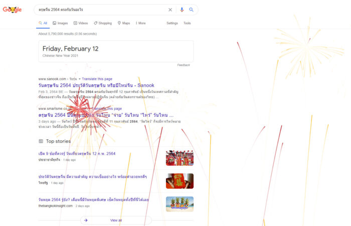 เมื่อเราต้องการรู้ “ตรุษจีน 2564 ตรงกับวันอะไร?” หน้า ของ google จะ เป็น หน้าฉลองปีใหม่ปี 2564 แบบใหม่ วันตรุษจีน 2564 ตรงกับวันศุกร์ที่ 12 กุมภาพันธ์ เป็นหนึ่งในเทศกาลที่สำคัญที่สุดของชาวจีน ถือเป็นวันขึ้นปีใหม่ตามปฎิทินจีน (คล้ายกับวันสงกรานต์ของไทย) ชาวจีนทุกคนให้ความสำคัญกับวันนี้อย่างมาก มีการหยุดงานเป็น