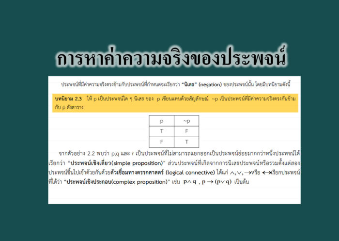 คณิตศาสตร์เสริม ( เลขเสริม ) การหาค่าความจริงของประพจน์ ในการเชื่อมประพจน์นั้นบางครั้งจะต้องใช้ตัวเชื่อมหลายตัวมาเชื่อมประพจน์ ซึ่งอาจทำให้เกิดปัญหาในการหาค่าความจริงว่าควรที่จะเริ่มต้นที่ตัวใดก่อน ดังนั้นจึงจำเป็นต้องมีการลำดับสัญลักษณ์ที่ “คลุมความ” มากที่สุดและรองลงมาตามลำดับ ตารางความจริง คือ ตารางที่สร้างขึ้นเพื่อใช้หาค่าความจริงของประพจน์
