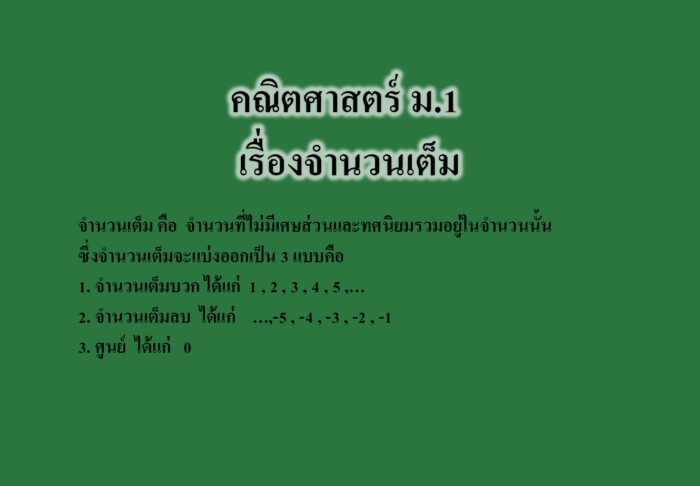 จำนวนเต็มคืออะไร จำนวนเต็ม คือ จำนวนที่ไม่มีเศษส่วนและทศนิยมรวมอยู่ในจำนวนนั้น ซึ่งจำนวนเต็มจะแบ่งออกเป็น 3 แบบคือ 1. จำนวนเต็มบวก ได้แก่ 1 , 2 , 3 , 4 , 5 ,… 2. จำนวนเต็มลบ ได้แก่ …,-5 , -4 , -3 , -2 , -1 3. ศูนย์ ได้แก่ 0 จำนวนเต็มบวก “จำนวนเต็มบวก” หรือเรียกอีกอย่างว่า “จำนวนนับ” ก็คือ จำนวนเต็มที่มีค่ามากกว่า 0 ขึ้นไป ได้แก่ 1, 2, 3, 4, 5,… นับไปเรื่อยๆ ไม่มีที่สิ้นสุด และบอกไม่ได้ด้วยว่าจำนวนนับตัวสุดท้ายคืออะไร จำนวนเต็มลบ “จำนวนเต็มลบ” หรือ “เลขติดลบ”…