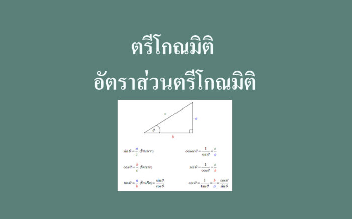 คณิตศาสตร์เรื่อง ตรีโกณมิติ อัตราส่วนตรีโกณมิติ คำว่า “ตรีโกณมิติ” ตรงกับคำ ภาษาอังกฤษ “Trigonometry” หมายถึง การวัด รูปสามเหลี่ยมได้มีการนำความรู้วิชาตรีโกณมิติไปใช้ในการหาระยะทาง พื้นที่ มุม และทิศทางที่ยากแก่การวัดโดยตรง เช่น การหาความสูงของภูเขา การหาความกว้างของแม่น้ำ เป็นต้น จากรูปสามเหลี่ยมมุมฉาก ABC ที่มีมุม C เป็นมุมฉาก