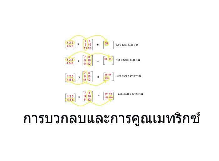 การบวก ลบ และคูณเมทริกซ์-เมทริกซ์ (Matrix) การบวก ลบ และคูณเมทริกซ์ เราจะนำสมาชิกของเมทริกซ์แต่ละเมทริกซ์มาบวก ลบ คูณกัน ซึ่งการดำเนินการเหล่านี้มีสมบัติและข้อยกเว้นต่างกันไป เช่น การบวกต้องเอาสมาชิกตำแหน่งเดียวกันมาบวกกัน เป็นต้น