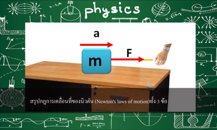 กฎการเคลื่อนที่ของนิวตัน (Newton’s laws of motion) กฎการเคลื่อนที่ของนิวตันเป็นกฎทางกายภาพสามข้อที่เป็นรากฐานของกลศาสตร์ดั้งเดิม ใช้สำหรับการอธิบายความสัมพันธ์ระหว่างวัตถุกับแรงที่กระทำต่อวัตถุนั้น และการเคลื่อนที่เนื่องจากแรงเหล่านั้น โดยในกฎข้อแรกเป็นการนิยามความหมายของแรง กฎข้อที่สองให้วิธีการวัดแรงในเชิงปริมาณ และกฎข้อที่สามอ้างว่าไม่มีแรงโด่ดเดี่ยว กฎข้อที่ 1 ΣF = 0 หรือกฎของความเฉื่อย “วัตถุจะรักษาสภาพหยุดนิ่ง หรือเคลื่อนที่ด้วยความเร็วคงที่ในทิศทางเดิมก็ต่อเมื่อ แรงลัพธ์ที่มากระทำ ต่อวัตถุมีค่าเท่ากับศูนย์”