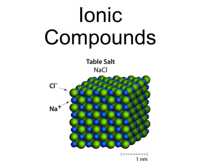 การเรียกชื่อสารประกอบไอออนิก สูตรและการอ่านชื่อสารประกอบไอออนิก เนื่องจากสารประกอบไอออนิกมีลักษณะการสร้างพันธะต่อเนื่องกันเป็นผลึก ไม่ได้อยู่ในลักษณะของโมเลกุลเหมือนในสารประกอบโคเวเลนต์ ดังนั้นสารประกอบไอออนิกจึงไม่มีสูตรโมเลกุลที่แท้จริง แต่จะมีการเขียนสูตรเพื่อแสดงอัตราส่วนอย่างต่ำของจำนวนธาตุต่าง ๆ ที่เป็นองค์ประกอบ เช่น โซเดียมคลอไรด์ เกิดจากอะตอมของธาตุโซเดียม (Na) อย่างน้อยที่สุด 1 อะตอม และอะตอมของธาตุคลอรีน (Cl) อย่างน้อยที่สุด 1 อะตอม จึงสามารถเขียนสูตรได้เป็น NaCl โดยการเขียนสูตรของสารประกอบไอออนิกจะเขียนนำด้วยธาตุที่เกิดเป็นไอออนบวก ก่อน จากนั้นจึงเขียนตามด้วยธาตุที่เกิดเป็นไอออนลบตามลำดับ