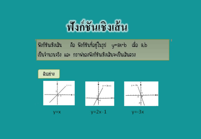 ฟังก์ชันเชิงเส้น ฟังก์ชันเชิงเส้น คือ ฟังก์ชันที่อยู่ในรูป y = ax+b เมื่อ a ,b เป็นจำนวนจริง และ กราฟของฟังก์ชันเชิงเส้นจะเป็นเส้นตรง