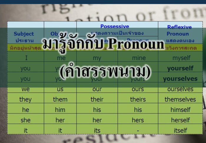 Pronoun คืออะไร ? Pronoun (คำสรรพนาม) คือคำที่ใช้แทนคำนาม เพื่อความสะดวกและความกระชับในการใช้ภาษา อย่างเช่นคำว่า I, you, he, she, it, we, they, everyone, someone เป็นต้น ในภาษาอังกฤษ เมื่อเรากล่าวซ้ำถึงคำนามใด หรือเมื่อเรากล่าวถึงสิ่งที่ทั้งผู้พูดและผู้ฟังรู้กันอยู่แล้วว่าหมายถึงสิ่งไหน เราจะเปลี่ยนไปใช้ pronoun แทน Pronoun พื้นฐาน 7 ตัวคือ I, you, he, she, it, we, they โดยทั้ง 7 ตัวนี้จะมีความพิเศษตรงที่ว่ามันมีหลายรูป เราจะต้องเลือกใช้รูปให้ตรงกับหน้าที่ในประโยค
