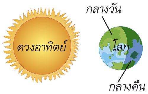 ช่วงเวลาที่มี แสงสว่างจากดวงอาทิตย์ มีระยะเวลา 12 ชั่วโมง ส่วนกลางคืน คือ ช่วงเวลาที่ ไม่มีแสงสว่างจากดวงอาทิตย์มีระยะเวลา 12 ชั่วโมง